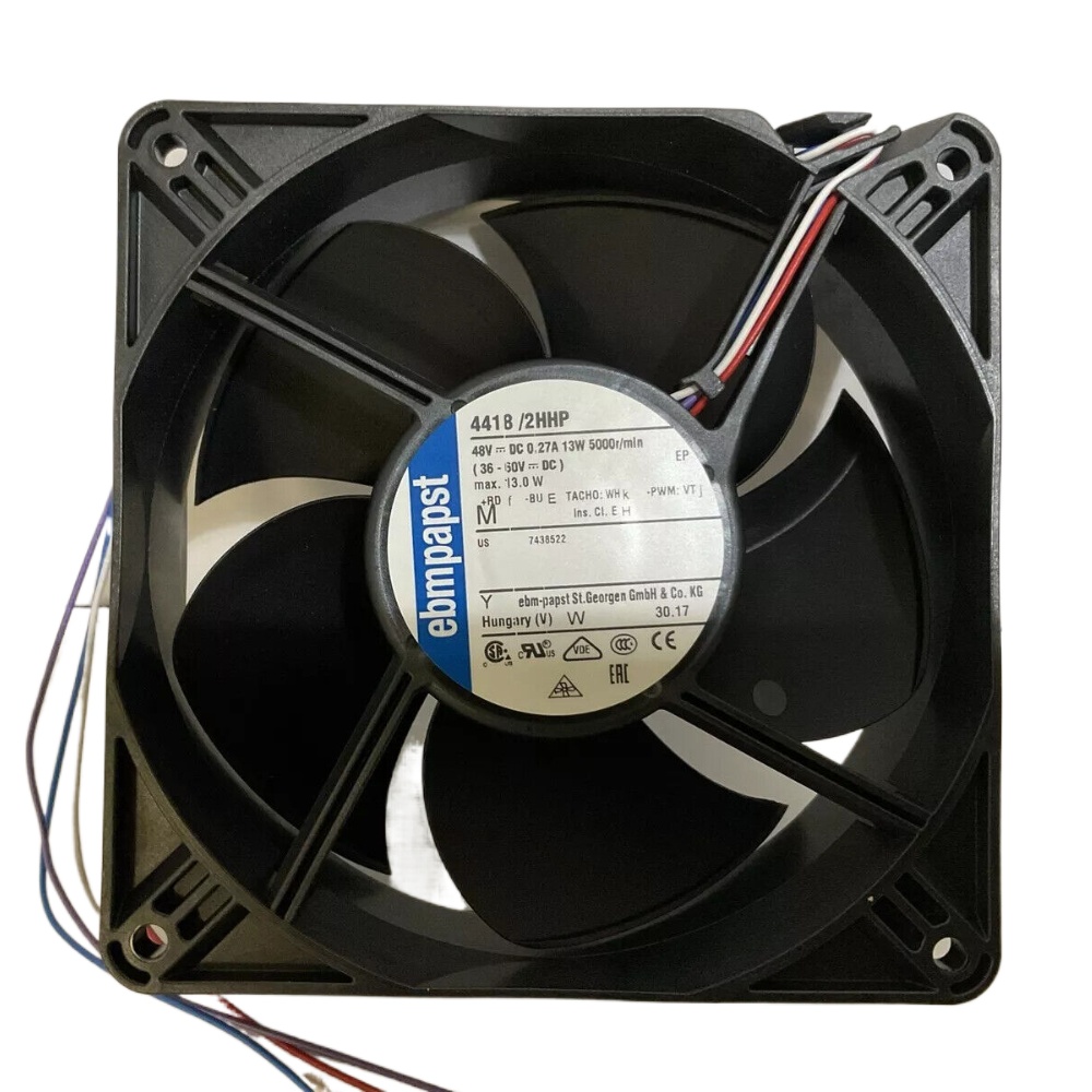 Ebm-papst 4418/2HHP Axial Fan 119x119x38mm 48VDC High Performance Ball Bearing. Nominal voltage: 48VDC, Power input: 18W, Speed: 6300 RPM, Airflow: 160 CFM, Noise level: 55 dBA, Bearing type: Ball bearing, Weight: 0.5 kg, Material: Fiberglass-reinforced plastic, Protection class: IP20, Ambient temperature range: -20°C to +70°C, Expected life: 65,000 hours at 40°C.