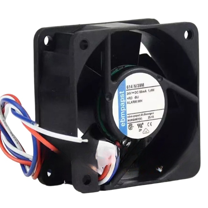 Ebm-papst 614N/39M Axial Fan 24VDC High Performance 160m³/h Compact Design is a compact and robust axial fan with high airflow of 160m³/h and low noise level of 47 dB(A). It operates at 24VDC with a power consumption of 3.6W and has a long service life of 65,000 hours.