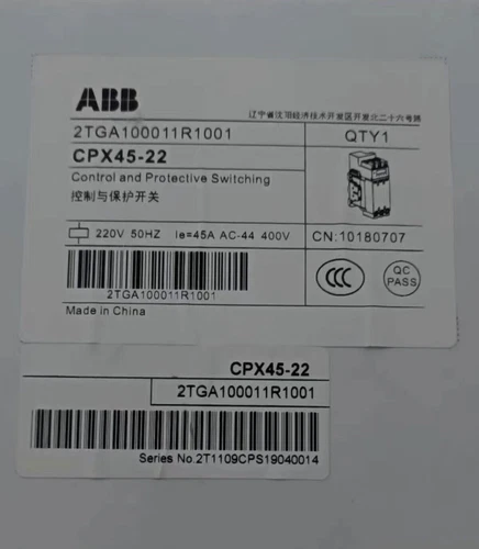 The ABB CPX45-22 Control Protection Switch offers reliable control and protection. Key specs include a current rating of 45A, voltage rating of 690V, and utilization category AC-3. Suitable for motor control and protection applications, providing efficient circuit management in industrial settings.