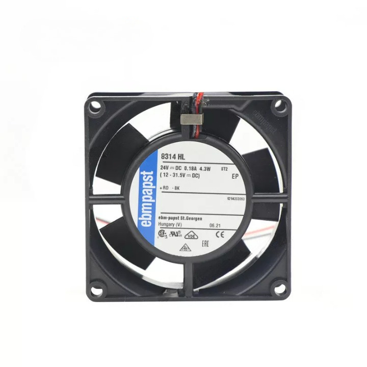Ebm-papst 8314HL Axial Fan 80x80x32mm 24VDC High Performance with Speed Signal is a compact, energy-efficient fan with a robust construction and advanced aerodynamic design. It features a ball bearing system, intelligent electronics, and is suitable for various applications including telecommunications, IT infrastructure, industrial automation, and medical devices.