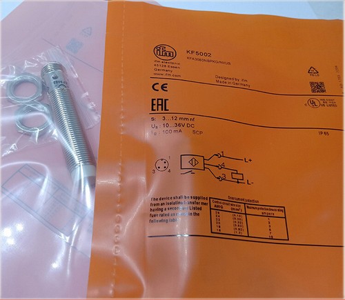 The IFM KF5002 Proximity Switch is a high-performance inductive sensor designed for precise and reliable object detection in demanding industrial environments. This sensor boasts a flush mountable design, simplifying installation and minimizing potential damage. Its key features include a generous 15mm sensing range, allowing for detection at a safe distance. The DC PNP output ensures compatibility with a wide range of control systems. The sensor features an M18 thread size for easy integration into existing machinery and setups. Its robust stainless steel housing provides exceptional resistance to mechanical stress, corrosion, and harsh chemicals, ensuring long-term durability and reliable operation even in challenging conditions. The IFM KF5002 is ideally suited for applications in industrial automation, conveying systems, machine tools, and other areas where accurate and dependable proximity sensing is crucial. Its high level of protection against dust and water ingress (IP67/IP68/IP69K) further enhances its suitability for use in harsh industrial environments. This proximity switch provides exceptional performance and reliability for a wide array of industrial sensing needs. The KF5002 model offers exceptional value and performance.